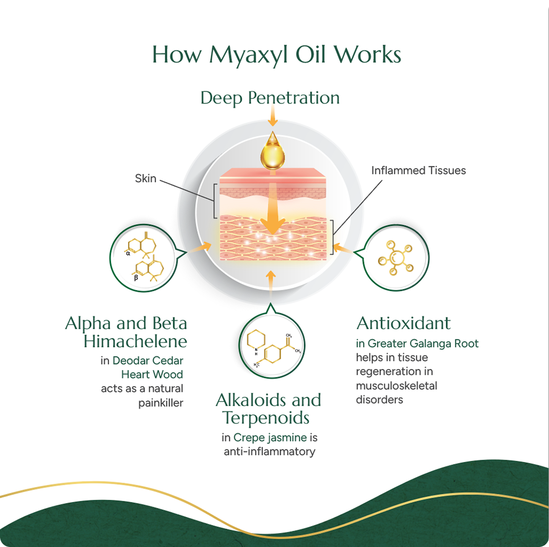 Myaxyl stands out because it’s crafted with all-natural, traditional Ayurvedic herbs like Devadaru, Rasna, and Nandivriksha, prepared in a sesame oil base using the Thaila Paaka Vidhi process. It is designed to support both immediate comfort and long-term deep tissue restoration*. Unlike many conventional muscle rubs, it doesn’t rely on harsh chemicals or create an intense burning sensation. Instead, it delivers a warm, soothing feel that’s gentle on the skin and easy to integrate into a daily wellness routine. With consistent use, its herbal blend helps support deeper muscle and joint wellness over time*, making it a preferred choice for those who value natural solutions and mindful movement.