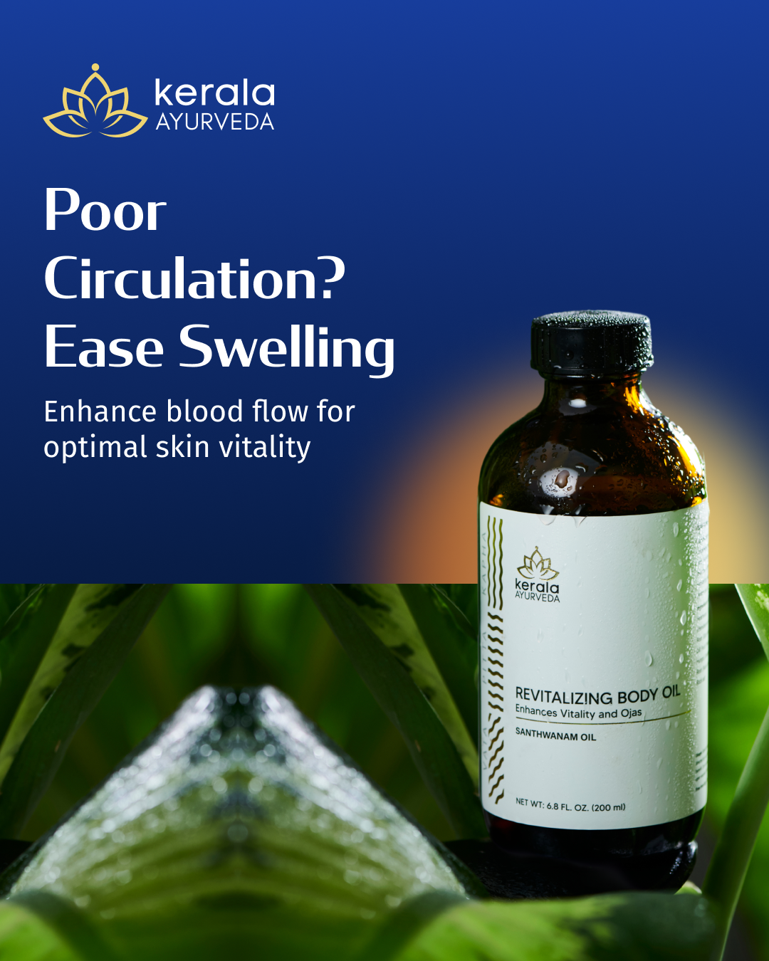 Poor circulation deprives the body of nutrients and vital oxygen, often resulting in tender, swollen parts of the body. Santhwanam Oil supports healthy circulation to minimize swelling and discomfort. Made from Boerhavia, Indian Madder, Arrow-Leaf Sida, and Hemidesmus Indicus, powerful herbs known for their natural anti-inflammatory properties, ability to encourage blood flow, and help optimize skin health.